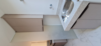 cozinha estilo americana com bancada em granito e piso em porcelanato