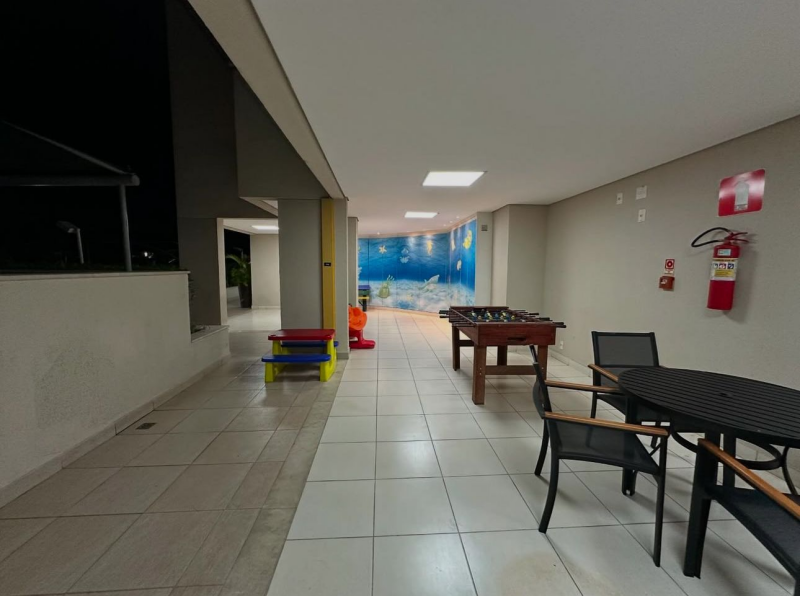 O condomínio conta com área de lazer completa: piscina, salão de festas, churrasqueira e playground.