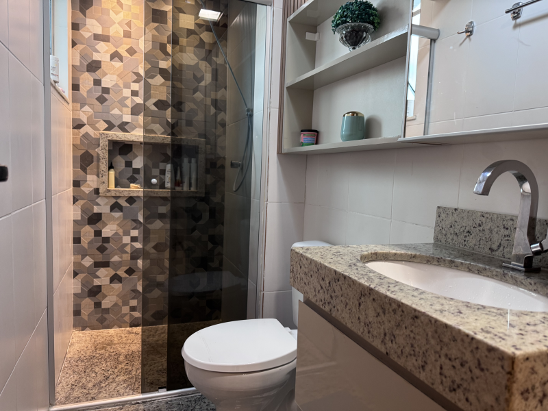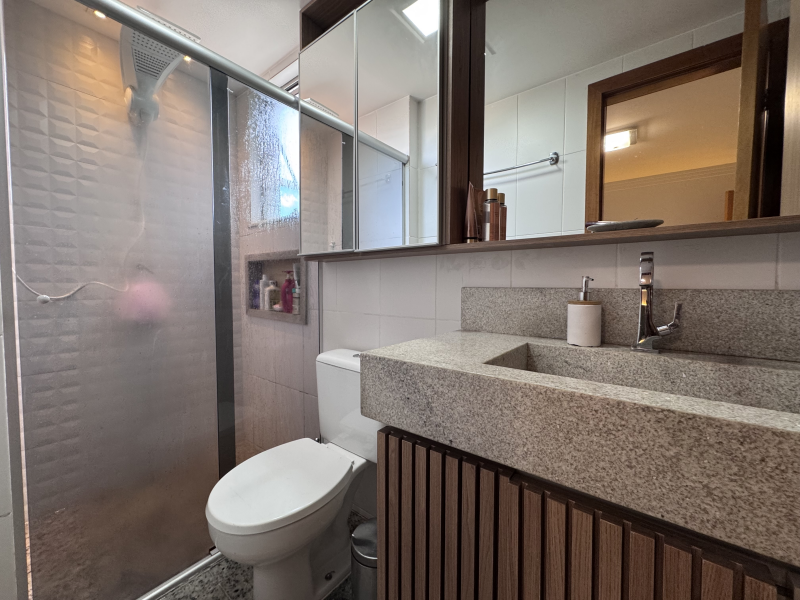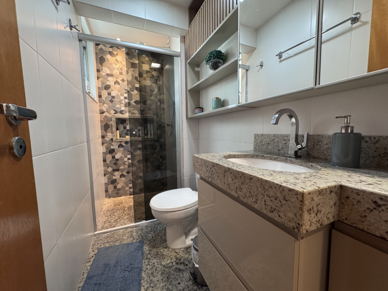 Banheiro social com armários planejados e box em vidro temperado;