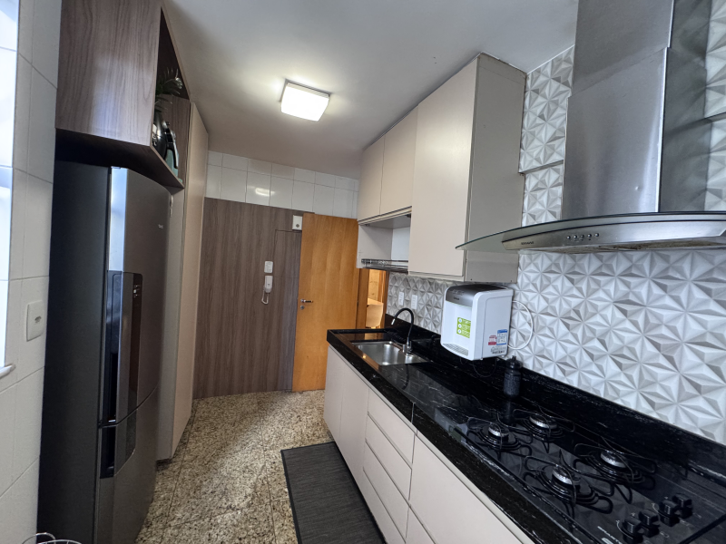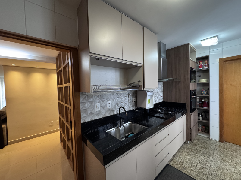 Cozinha espaçosa, com armários planejados, bancadas e piso em granito;