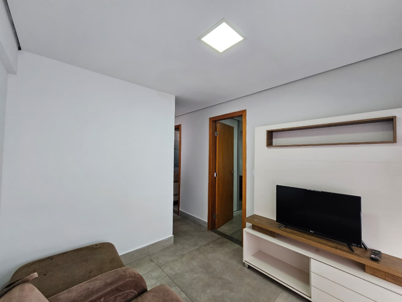 Sala com sofá cama podendo ser transformada em quarto, painel televisão mesinha de centro.
