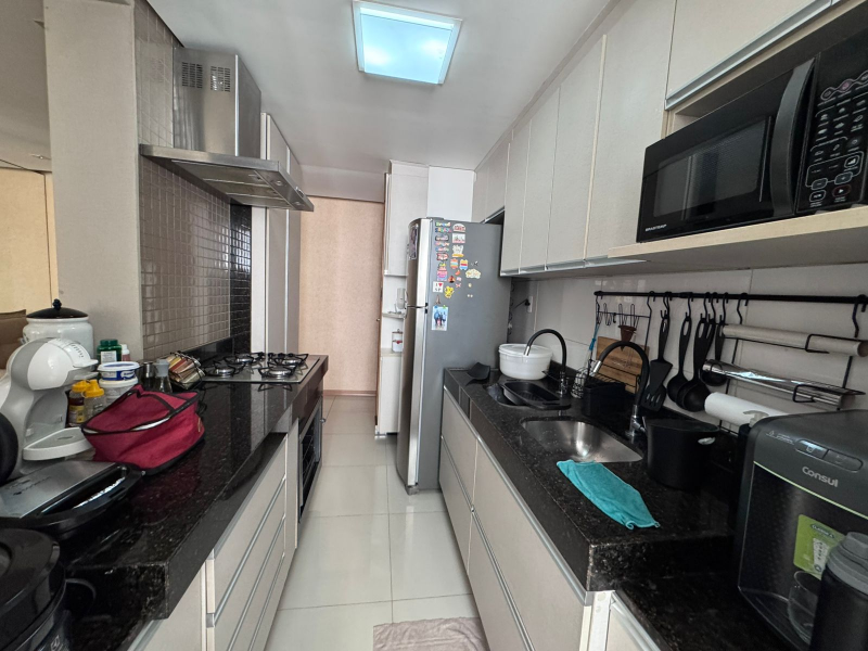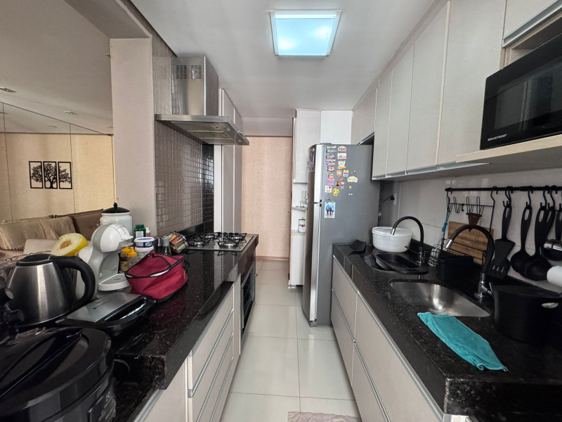 A cozinha é equipada com armários planejados, proporcionando organização e ótimo aproveitamento do espaço, além de funcionalidade no preparo das refeições.