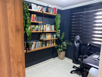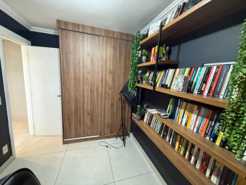 1 quarto reversível, atualmente utilizado como escritório, com prateleiras para livros