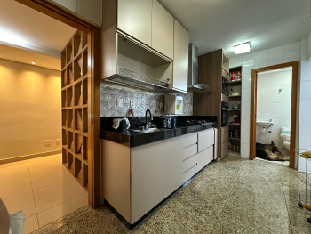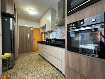 Cozinha espaçosa, com armários planejados, bancadas e piso em granito;