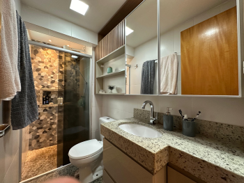 Banheiro social com armários planejados e box em vidro temperado;