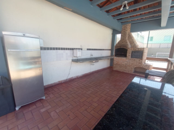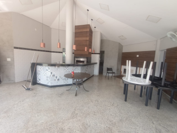 Área externa com espaço gourmet, piscina e duas vagas de garagem.